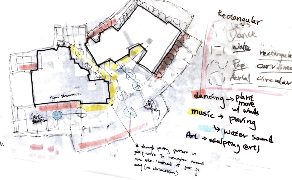 I’m digging through the PPN Professional Links. Green Cities: Good Health appeals to me. After the industrial revolution, hardscape, especially concrete, began to dominate our cities. According to Green Cities: Good Health, shoppers will spend more time in the place if there is lots of greenery (Wolf, 2018). This idea of injecting a vivacious atmosphere inspired three layout concepts based on the movement of dancing. First, the waltz has a more rigid form which will be my rectangular layout. Second, salsa is very fluid which will be the curvilinear form. Third, a circular layout closely resembles aerial dancing as the dancers rotate around with ropes in the air. In my circular theme, I substitute existing brick pavings with shrubs, trees, seatings, and green sculptures. I also bring the outdoors inside and vice versa to make boundaries with greenery more seamless. The eating area I plan to make will seat twenty people and provide them with a private setting. The site users will have greater mental health when they are relaxed and restore their mind (Wolf, 2018). The new design pathway will also require visitors to meander around and have a greater exposure of the site. Therefore, this approach provides more physical exercise for Cal Poly students and creates more mental fatigue recovery time from their stressful studying.