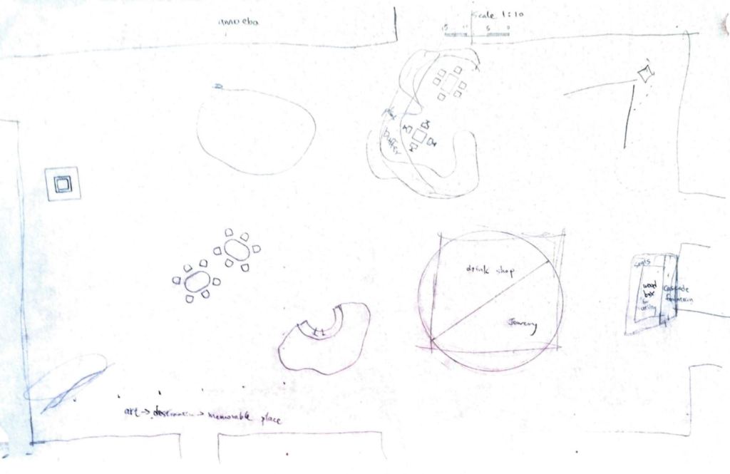 When I look at Roberto Burle Marx’s work, it has a very strong paving pattern. It brings intense energy and thrill into a landscape. All the stores around my garden plaza are trying to attract customers. Thus, by making my paving pattern simple and crisp, users will feel relaxed and calm in the space. Those planting islands are inspired by blobby Amoeba to create fluidity and flow in this garden plaza.